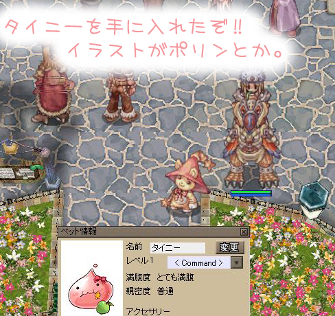 タイニーのものまねサイドストーリーズ(MSS?)っていうクエストをクリアするとペットの卵と帽子がもらえます。モンスターサイドストーリーズとほぼ同じで3話までおもいっきりぱくってます。NPCの場所も一緒なので迷うことはないはずw