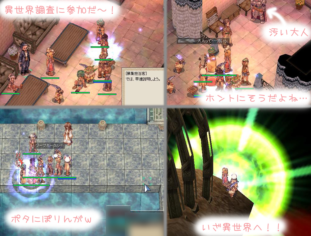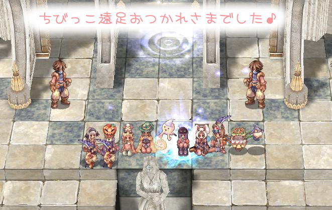 終了前に恒例の握手像の前で記念写真…はNPCが居るのと人が多いのとで断念。違うところはどこがいいだろう…と相談の結果ラヘルで撮影することに。ハロウィンNPCのルードを真ん中にしてパシャリしてきましたw